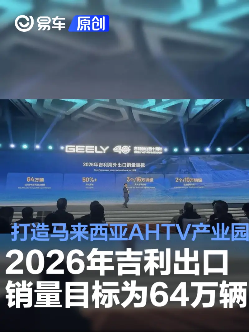 2026年吉利出口销量目标为64万辆,同比增长50%,形成3个15万辆级、2个10万辆级的全球区域市场,将重点发力三个方向:首先,以东南亚作为战略枢纽,要打造马来西亚AHTV产业园为桥头堡,构建年产50万辆的“延-产-销-服”的一体化产业园,辐射东盟市场;