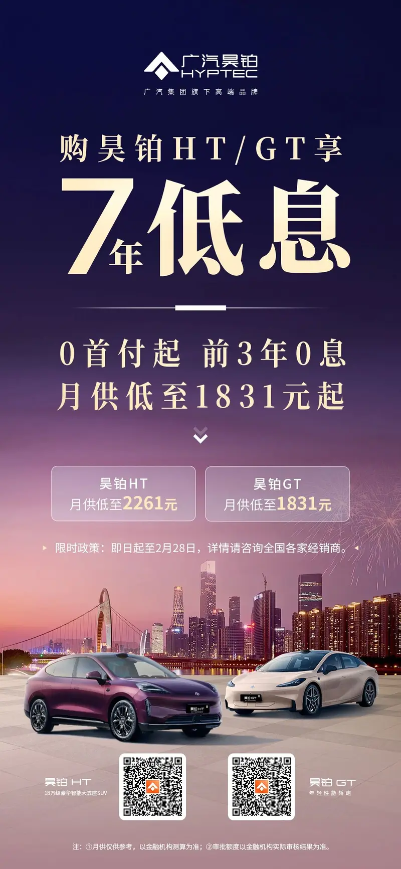 广汽昊铂HT/GT推出7年低息限时购车政策 2026-01-28 09:04 来源:汽车产经网 作者:易车原创报道 举报 易车讯 日前,广汽昊铂官方宣布购昊铂HT和GT可享受7年低息政策。0首付起,前3年0息,月供低至1831元起。 具体来看,即日起至2月28日,昊铂HT月供可低至2261元,昊铂GT月供可低至1831元。