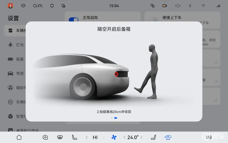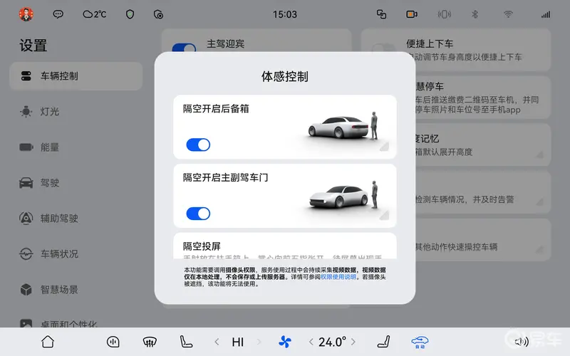 1、开关路径:设置-车辆控制-体感控制-手势控制-隔空开启后备箱/隔空开启主副驾车门