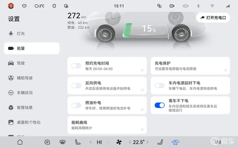 1、设置-能量-离车不下电 可打开/关闭离车不下电开关