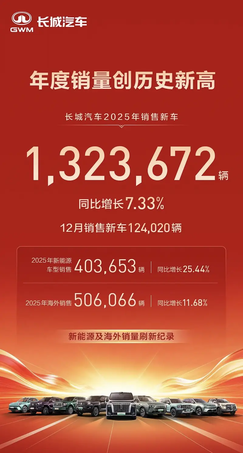 此前,长城汽车发布了2025销售数据,销售新车1323672辆,同比增长7.33%。其中,新能源车型销售403653辆,同比增长25.44%。海外销售506066辆,同比增长11.68%。