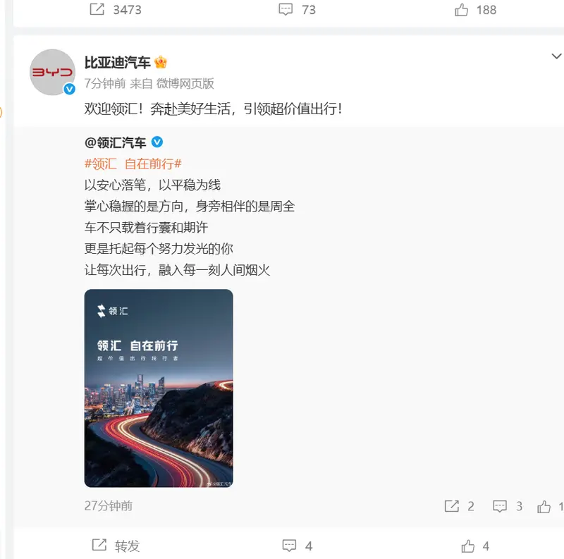 易车讯 2月2日,比亚迪正式发布全新汽车品牌领汇汽车,以技术创新重新定义出行,以高质量的产品满足全场景使用需求,共同奔赴“自在前行”的新美好。