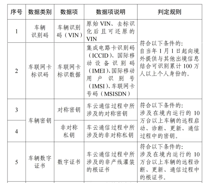 汽车数据处理者在车辆联网运行过程中,收集和产生的车辆识别码、车联网卡标识码、车辆密钥、车辆数字证书、控制指令。