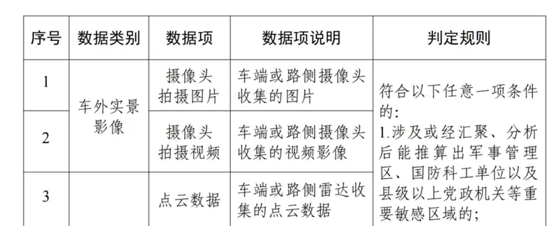 汽车数据处理者在车辆及路侧设备联网运行过程中,收集和产生的车外实景影像、雷达、位置轨迹、惯性导航、自动驾驶地图、构图类数据。