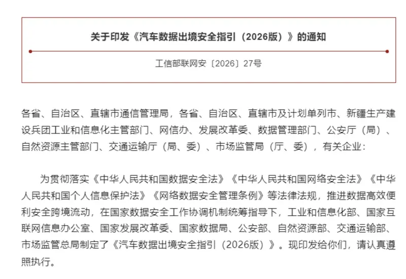 易车讯 2月3日,为推动建立高效便利安全的汽车数据跨境流动机制,提升汽车数据出境便利化水平,推动构建汽车产业高质量发展和高水平安全良性互动格局,工业和信息化部、国家网信办、国家发展改革委、国家数据局、公安部、自然资源部、交通运输部、市场监管总局等八部门近日联合印发《汽车数据出境安全指引(2026版)》(以下简称《安全指引》)。