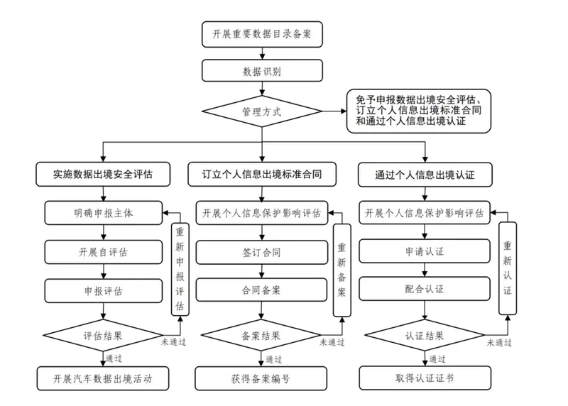 汽车数据处理者按照《数据出境安全评估办法》《促进和规范数据跨境流动规定》《数据出境安全评估申报指南(第三版)》,开展数据出境风险自评估并整改风险问题,向网信部门提交申报材料。通过数据出境安全评估的,汽车数据处理者开展数据出境活动;出现影响出境数据安全情形的,应当重新申报评估。
