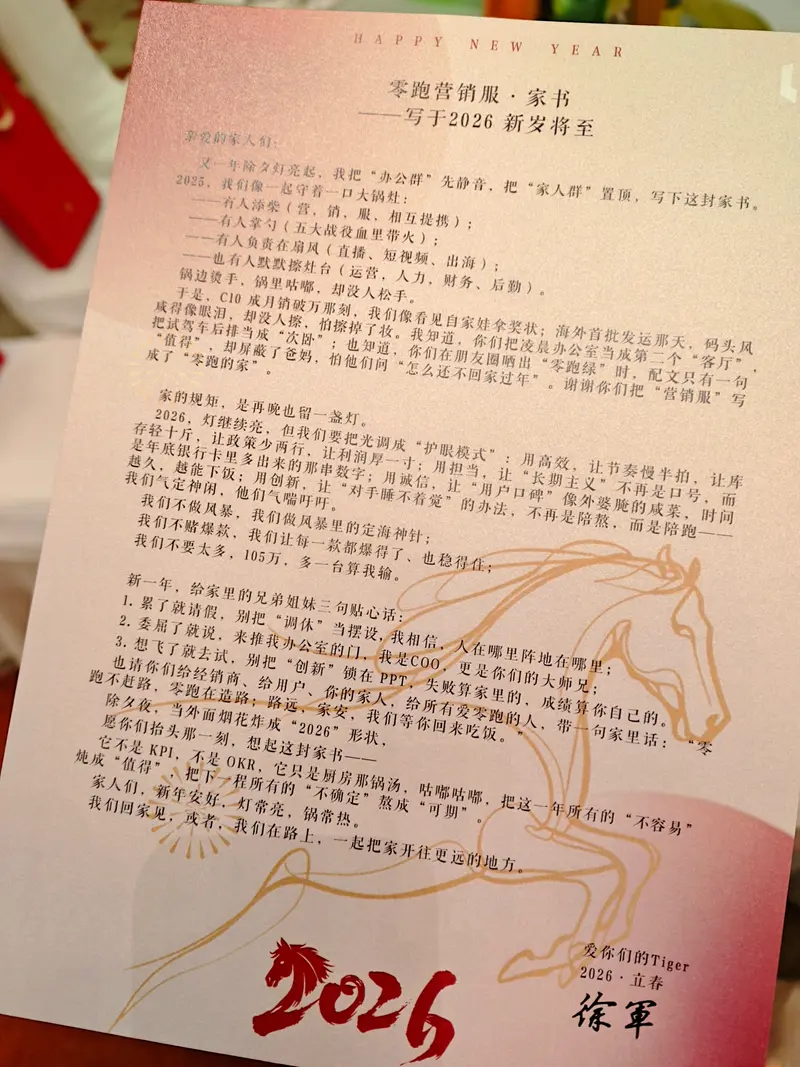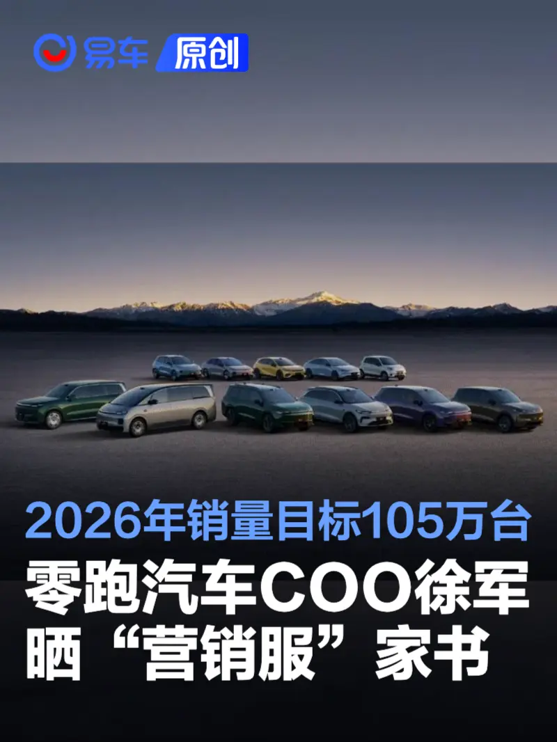 易车讯 2月5日消息,零跑汽车COO徐军晒出“写给零跑营销服的家书”,文中提到,“2026 年用高效让节奏慢半拍,让库存轻 10 斤、让政策少两行、让利润厚一寸。”