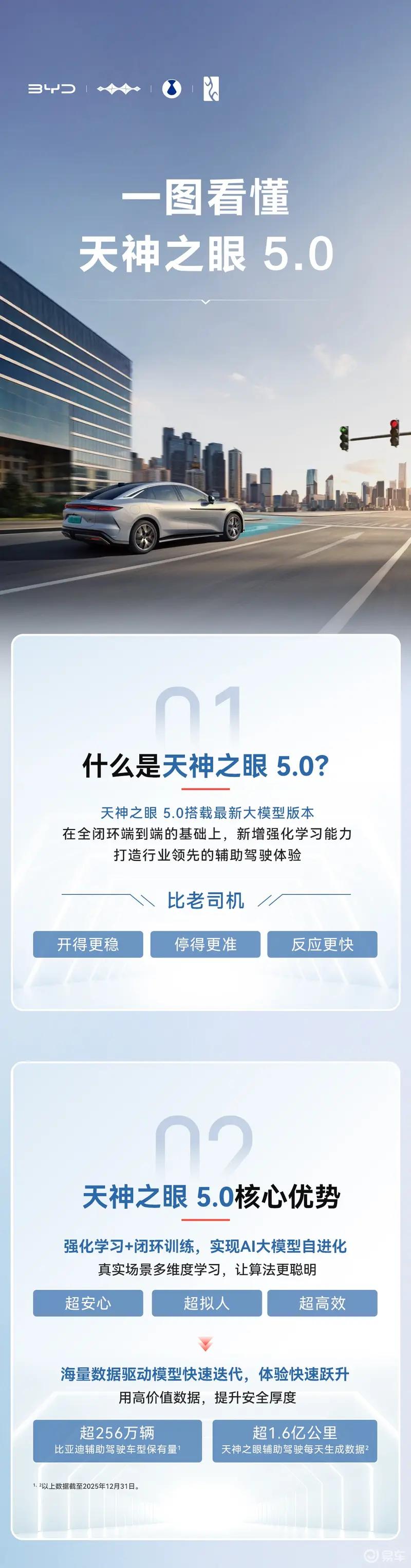 天神之眼5.0核心优势为强化学习+闭环训练,实现AI大模型自进化,通过真实场景多维度学习,让算法更聪明,带给用户超安心、超拟人、超高效的辅助驾驶体验。新版本依靠海量数据驱动模型快速迭代,体验快速跃升,用高价值数据,提升安全厚度。截止去年年底,比亚迪拥有超256万辆辅助驾驶车型,天神之眼辅助驾驶每日生成数据超1.6亿公里。