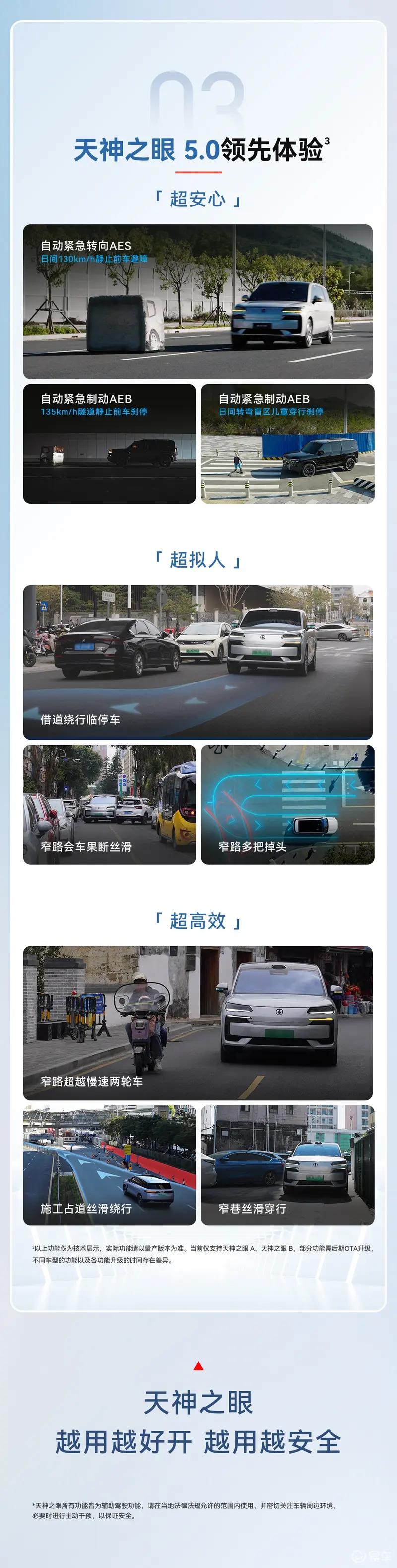 天神之眼5.0系统增加了自动紧急转向AES、自动紧急制动AEB功能,包含日间130km/h静止前车避障、135km/h隧道静止前车刹停、日间转弯盲区儿童穿行刹停,支持借道绕行临停车、窄路会车果断丝滑、窄路多把掉头,并能够实现窄路超越慢速两轮车、施工占道丝滑绕行以及窄巷丝滑穿行。