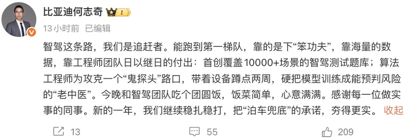 易车讯 日前,比亚迪股份有限公司执行副总裁何志奇发文谈到智驾的发展。并表示,智驾这条路,我们是追赶者。能跑到第一梯队,靠的是下“笨功夫”,靠海量的数据,靠工程师团队日以继日的付出:首创覆盖10000+场景的智驾测试题库;算法工程师为攻克一个“鬼探头”路口,带着设备蹲点两周,硬把模型训练成能预判风险的“老中医”。