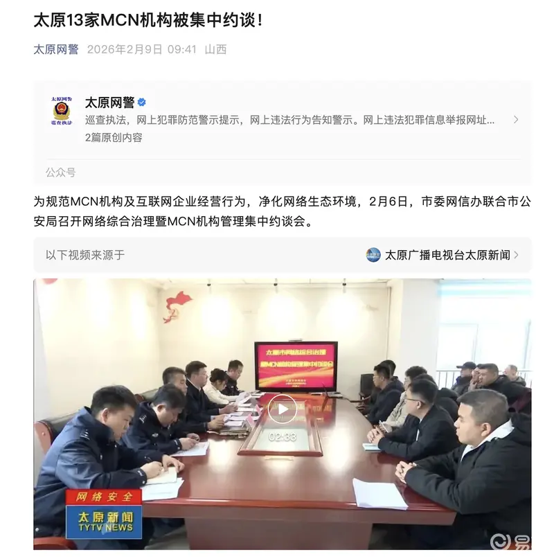 易车讯 2月9日,太原网警在官方公众号发文表示,2月6日,市委网信办联合市公安局召开网络综合治理暨MCN机构管理集中约谈会。针对近期网络上出现的,由部分MCN机构及博主针对小米、理想等新能源车企,进行贬损及恶意评价,损害新能源车企品牌声誉等乱象,会议强调,任何MCN机构与网络内容创作者(“网络大V”)必须要严格遵守行业规范与商业伦理,不得组织或参与针对企业及产品的网络水军、恶意投诉、引战炒作等行为,共同维护公平竞争、健康清朗的市场与网络环境。