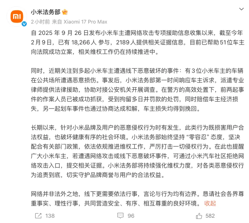 易车讯 2月9日,小米法务部官方发文表示,自2025年9月26日发布小米车主遭网络攻击专项援助信息收集以来,截至今年2月9日,已有18,266人参与,2189人提供相关证据信息,目前已帮助51位车主向法院成功立案,相关维权工作仍在持续推进中。