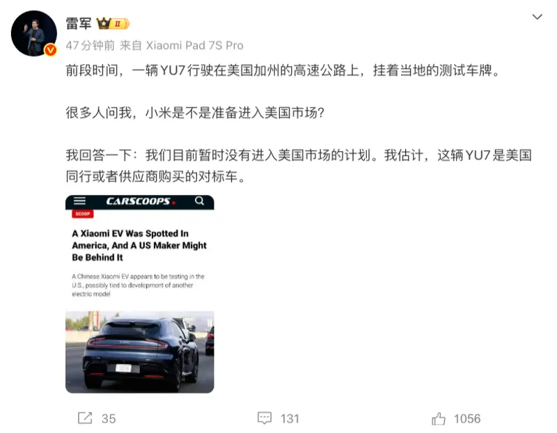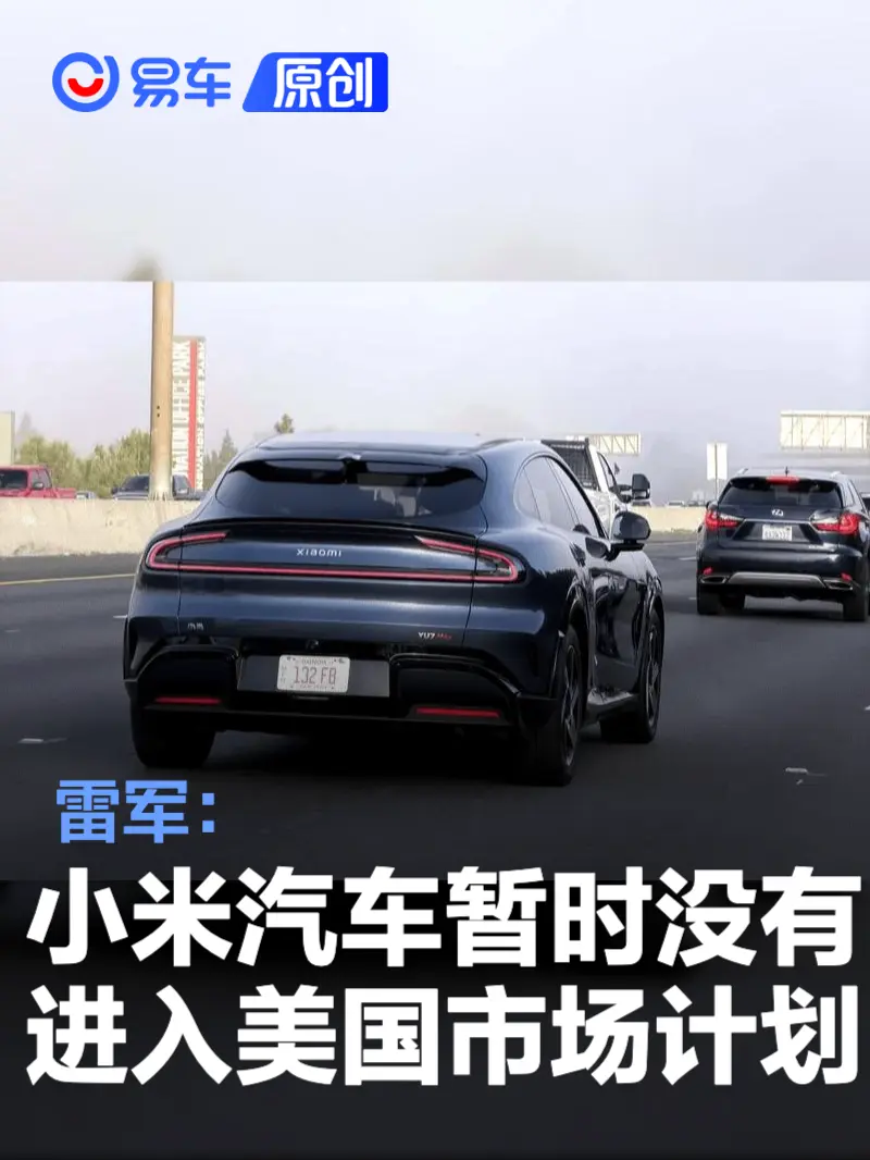 雷军:小米汽车暂时没有进入美国市场计划 2026-02-10 09:27 来源:汽车产经网 作者:易车原创报道 举报 易车讯 2月10日,小米创办人,董事长兼CEO雷军在微博上针对前段时间,一辆YU7行驶在美国加州的高速公路上,挂着当地的测试车牌,进行了解释。 雷军表示,我们目前暂时没有进入美国市场的计划。我估计,这辆YU7是美国同行或者供应商购买的对标车。