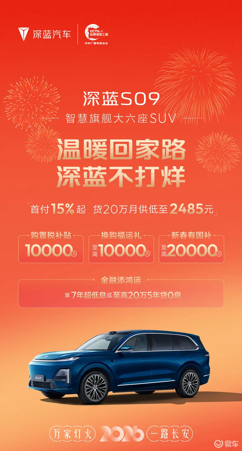 购买深蓝S09可享购置税补贴10000元;换购福运礼至高10000元;国补至高20000元;享7年超低息或20万5年贷0息。详情可咨询当地授权经销商。