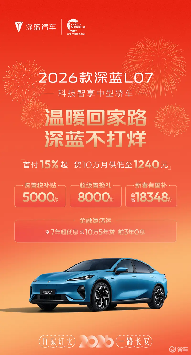 购买2026款深蓝L07可享购置税补贴5000元;超级置换礼8000元;国补至高18348元;享7年超低息或10万5年贷(前3年0息)。