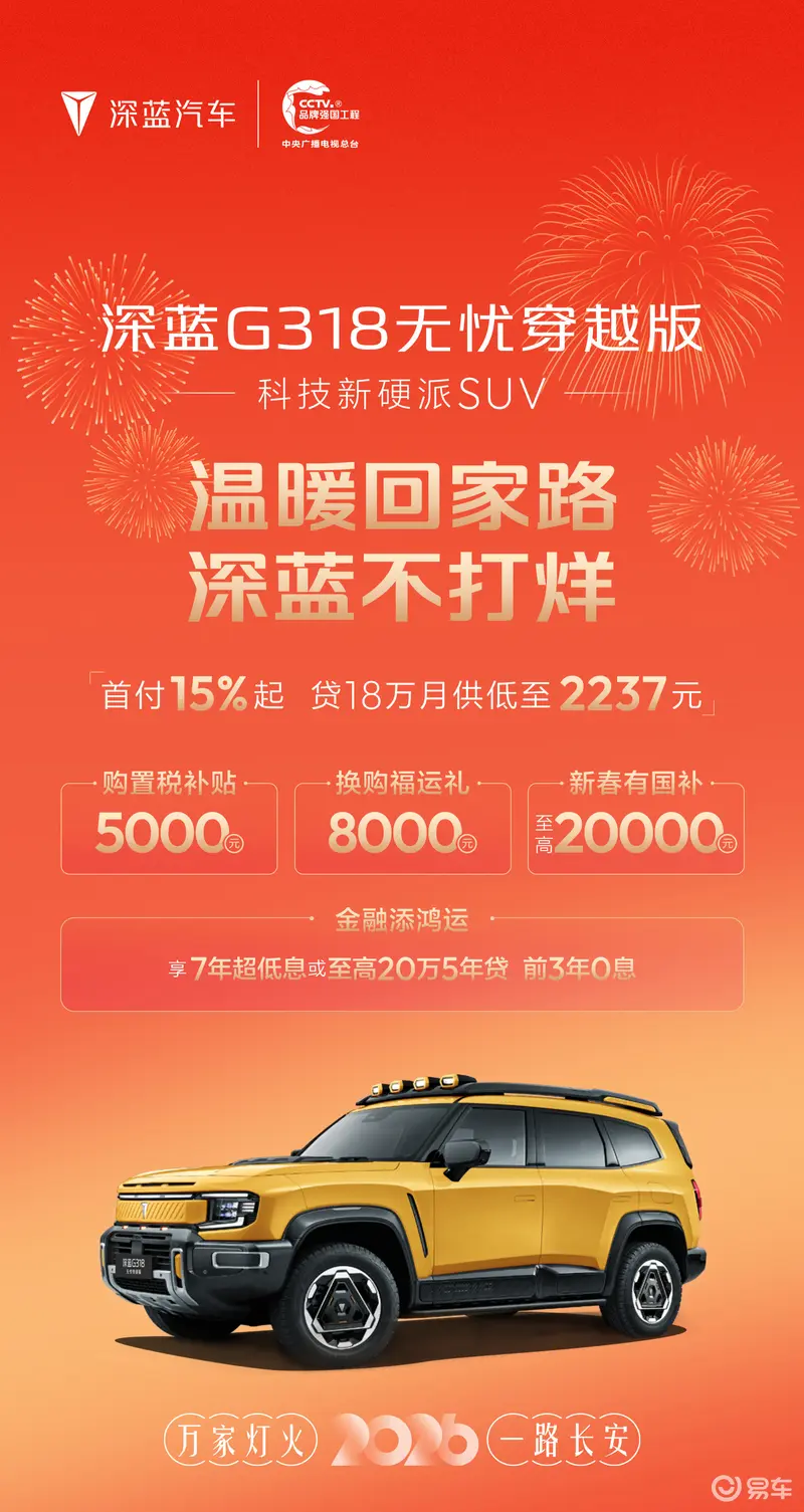 据介绍,购买深蓝G318无忧穿越版可享购置税补贴5000元;换购福运礼8000元;国补至高20000元;享7年超低息或至高20万5年贷(前3年0息)。首付15%起,贷款18万月供低至2237元。