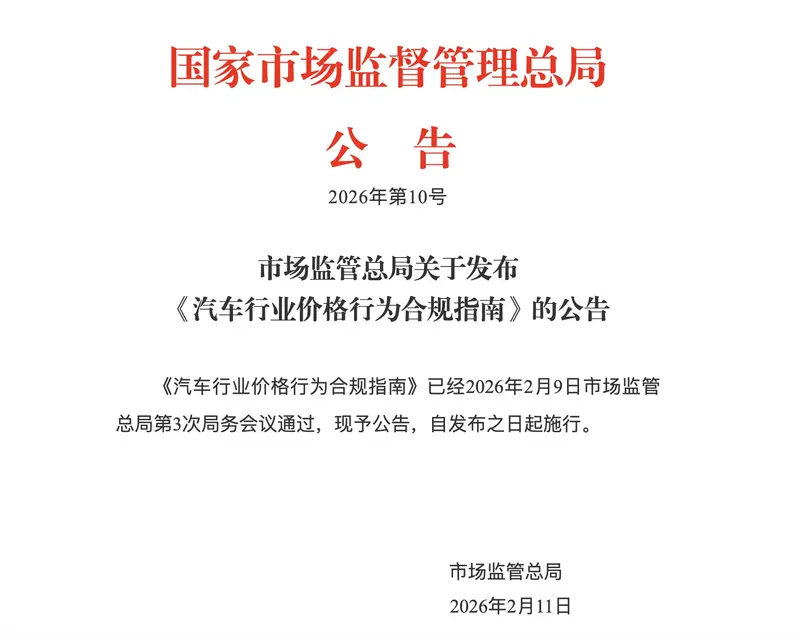易车讯 2月12日,国家市场监管总局关于发布《汽车行业价格行为合规指南》的公告,表示《汽车行业价格行为合规指南》已经于2026年2月9日市场监管总局第3次局务会议通过,现予公告,自发布之日起施行。以下为《汽车行业价格行为合规指南》原文: