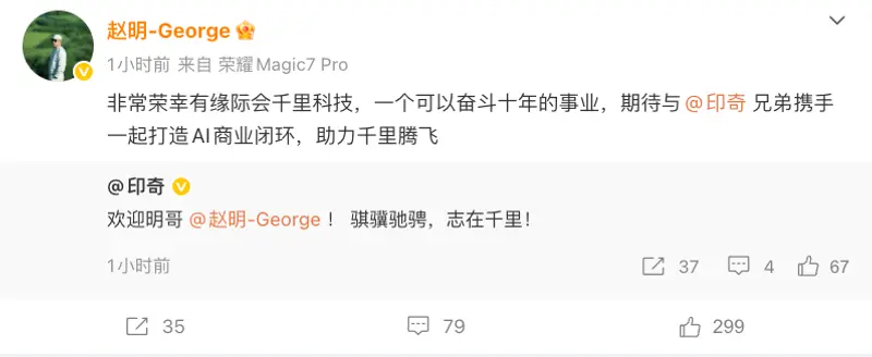 易车讯 2月12日,荣耀前CEO赵明宣布加入千里科技,任联席董事长,同时被推选为公司第六届董事会非独立董事候选人。赵明表示,非常荣幸有缘际会千里科技,一个可以奋斗十年的事业,期待与印奇兄弟携手一起打造AI商业闭环,助力千里腾飞。