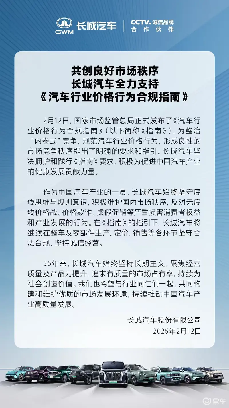 易车讯 近日,长城汽车官方发布声明,全力支持《汽车行业价格行为合规指南》,始终坚持长期主义,坚守合法合规,坚持诚信经营,积极维护国内市场秩序。