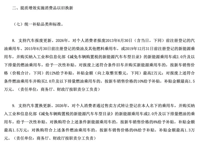 通知提到,对换购符合上述条件新能源乘用车的,按新车销售价格的8%给予补贴,补贴金额最高1.5万元;对换购符合上述条件燃油乘用车的,按新车销售价格的6%给予补贴,补贴金额最高1.3万元。