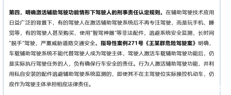 易车讯 2月13日,最高人民法院首次发布道路交通安全刑事专题指导性案例,明确了相关裁判规则,其中第四条提到,明确激活辅助驾驶功能情形下驾驶人的刑事责任认定规则。