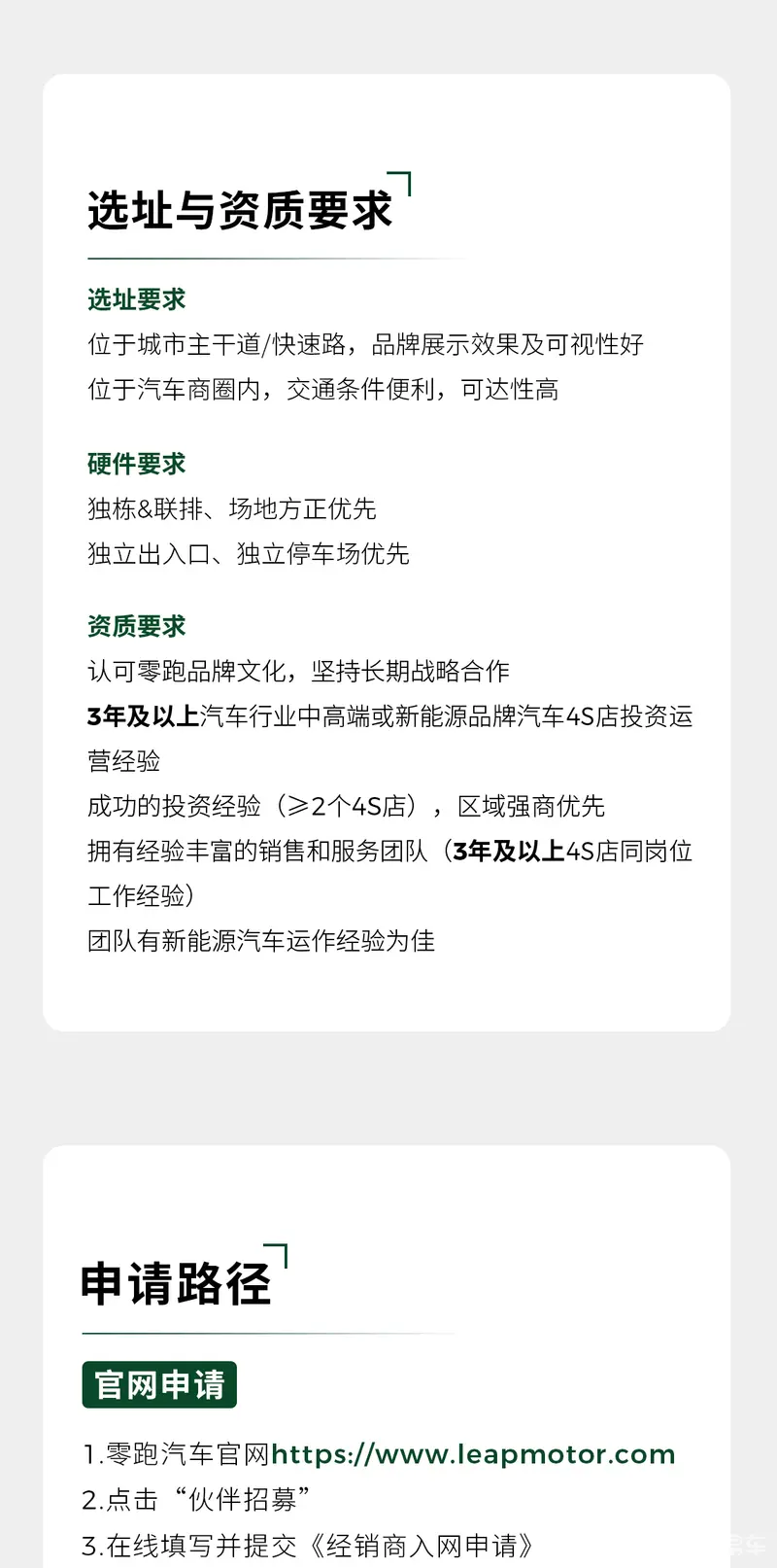 位于汽车商圈内,交通条件便利,可达性高;硬件要求方面,独栋&联排、场地方正优先;独立出入口、独立停车场优先;资质要求方面,认可零跑品牌文化,坚持长期战略合作;3年及以上汽车行业中高端或新能源品牌汽车4S店投资运营经验;成功的投资经验区域强商优先(>2个4S店),拥有经验丰富的销售和服务团队(3年及以上4S店同岗位