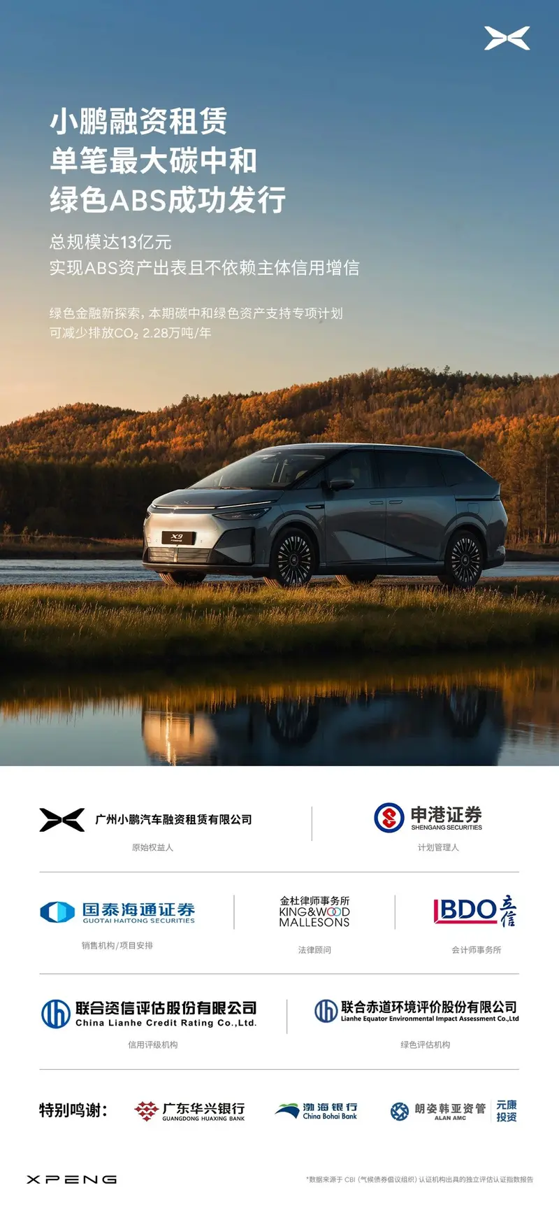 自成立以来,小鹏汽车始终将可持续发展作为企业核心责任,不仅将ESG贯穿公司战略,更通过扎实的产业实践将其贯穿研发、生产、供应链与用户服务的全链条中,以实际行动践行可持续发展。小鹏汽车本期项目的绿色等级经评定为G1(最高评级),基础资产池涉及项目预计每年可减少排放二氧化碳2.28万吨,节约标准煤1.08万吨,环境效益显著。本项目资金将专项用于新能源智能汽车等绿色资产投放,加速新能源智能汽车的普及,积极响应国家“双碳”战略目标。