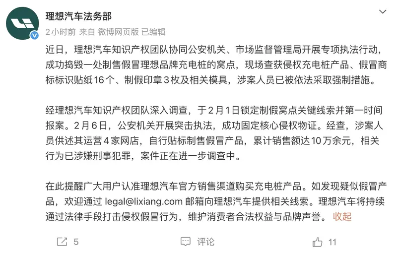 易车讯 2月13日,理想汽车法务部在官微发文表示,近日,理想汽车知识产权团队协同公安机关、市场监督管理局开展专项执法行动,成功捣毁一处制售假冒理想品牌充电桩的窝点,现场查获侵权充电桩产品、假冒商标标识贴纸16个、制假印章3枚及相关模具,涉案人员已被依法采取强制措施。