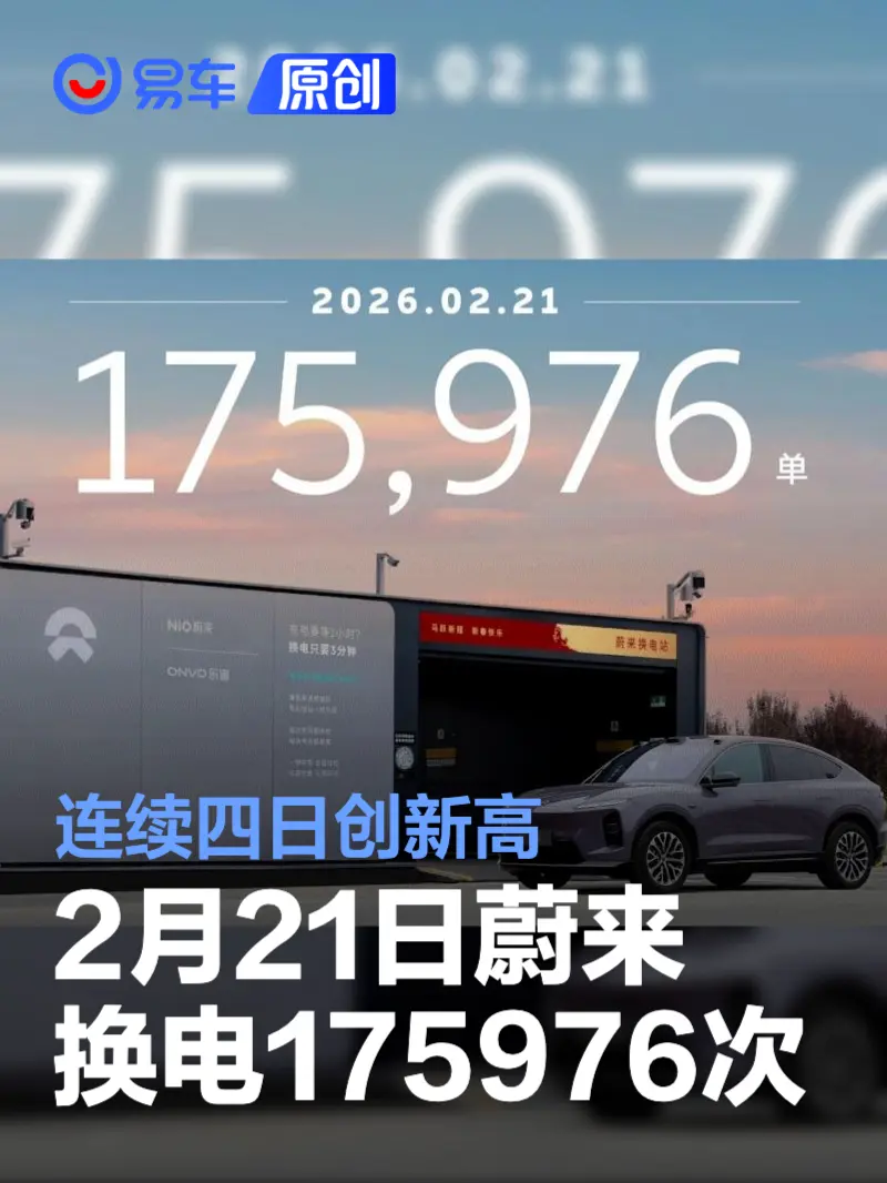易车讯 2月22日蔚来公布了春节期间最新换电数据。2026年2月21日大年初五,蔚来换电单日总量达175976次,又创历史新高,平均不到0.5秒就有一台车完成换电!马年新春以来,已连续四日刷新历史新高!
