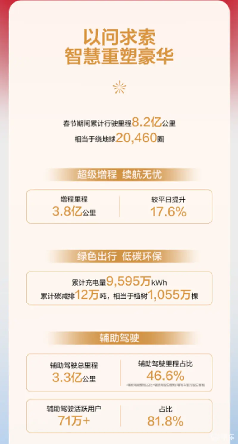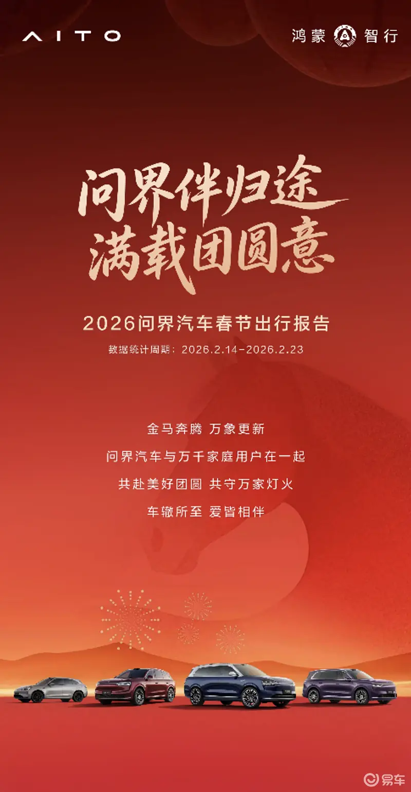 易车讯 近日,问界汽车发布《2026问界汽车春节出行报告》,报告显示,春节期间问界车主累计行驶里程8.2亿公里,相当于绕地球20460圈,其中增程里程3.8亿公里,较平日提升17.6%。春节期间,问界用户累计充电量9595万kWh,累计碳减排12万吨,相当于植树1055万棵。
