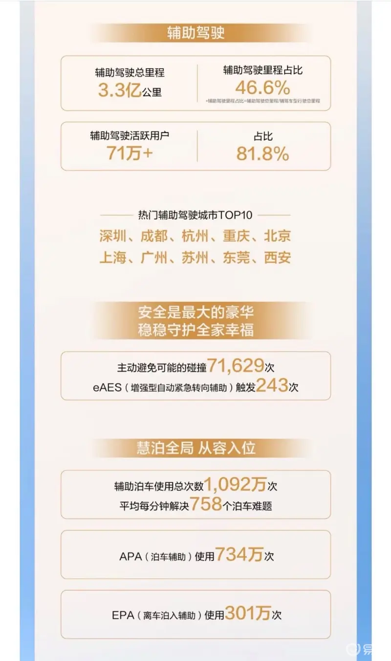 春节期间,问界辅助驾驶总里程高达3.3亿公里,辅助驾驶里程占比46.6%,其中,辅助驾驶活跃用户突破71万,占比高达81.8%,辅助泊车使用总次数达1092万次,平均每分钟解决758个泊车难题,APA(泊车辅助)使用734万次,EPA(离车泊入辅助)使用301万次。