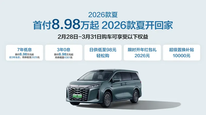 2026款夏开年献礼,让高品质家庭出行不再遥不可及。截至2026年3月31日下单限时享10000元超级置换补贴,首付8.98万元起即可拥有这款“家庭头等舱”,让全家人都能享受每一程。开年福利限时放送,有换车计划的朋友,趁现在,给家人一个惊喜!
