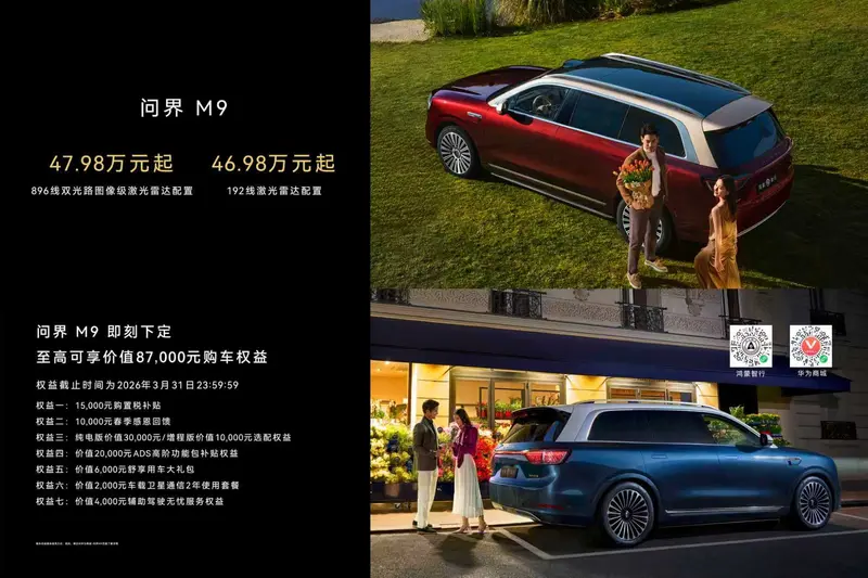 搭载新一代激光雷达的尊界S800和问界M9今日开启预定,尊界S800建议零售价72.8万元起,即刻下定,可享1.5万元购置税补贴,产品选配金权益、ADS高阶包赠送等多重权益。问界M9建议零售价47.98万元起,即刻下定,可享1.5万元购置税补贴,产品选配金权益、ADS高阶包补贴等多重权益。