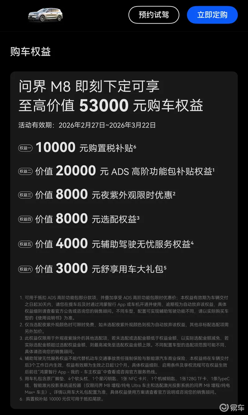 易车讯 近日,问界M8特别推出3月限时购车权益,2026年2月27日至3月22日,下定可享至高价值53000元购车权益。