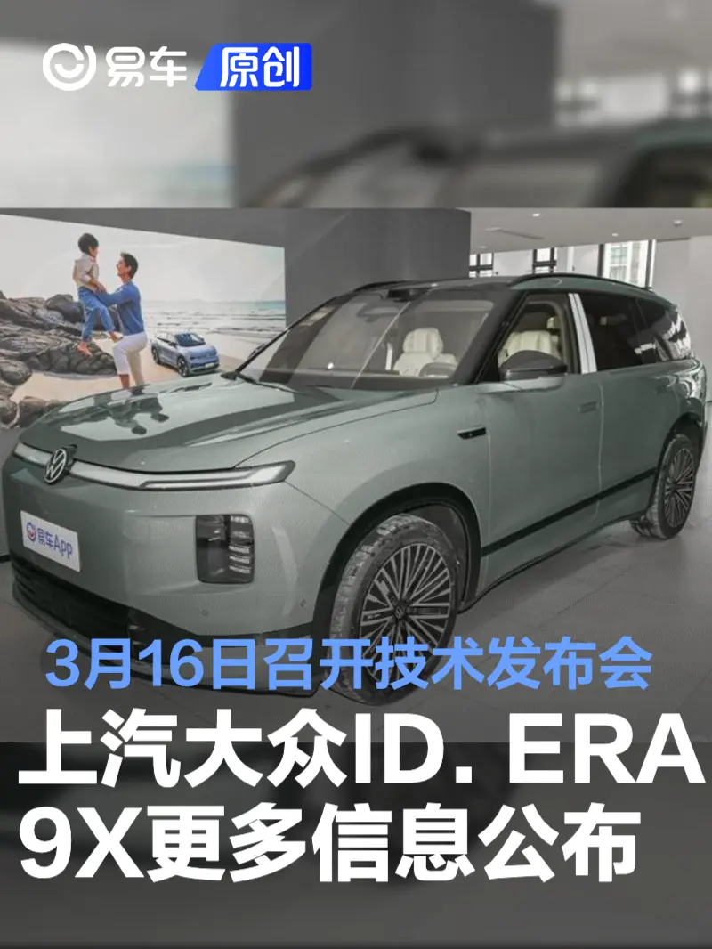 易车讯 3月12日,上汽大众官方公布了ID. ERA 9X更多信息,新车将于3月16日召开技术发布会,3月底正式开启预售。新车将提供6种外观颜色及3种内饰供消费者选择。