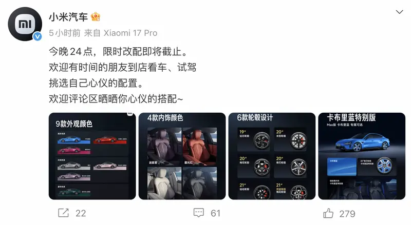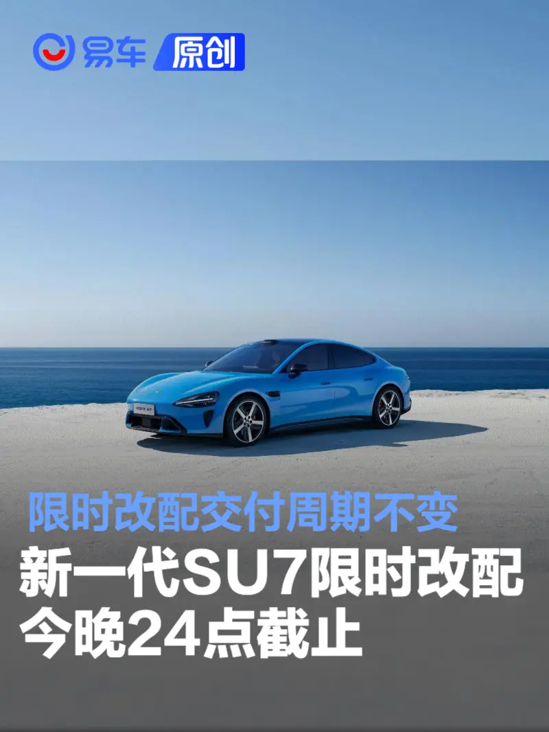 易车讯 3月22日,小米汽车官方宣布,新一代SU7限时改配将于今晚24点截止。根据官方介绍,新一代SU7在锁单后可限时改配,且交付周期不变。