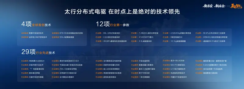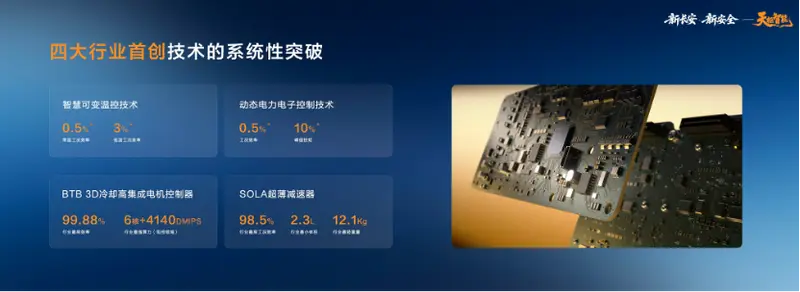 在核心技术突破方面,带来了四大行业首创技术:首创智慧可变温控技术,为电机装上“智能空调”,常温工况效率提升0.5%,低温下提升3%;首创动态电力电子控制技术,实现智能动态调控,动力响应随叫随到;首创BTB(功率砖)3D冷却高集成电机控制器,搭载全球量产最高的六核电控芯片,每秒运算超40亿次,电机控制器最高效率达99.88%;首创SOLA超薄减速器,具备98.5%的全球量产最高CLTC工况效率,重量仅12.1kg。