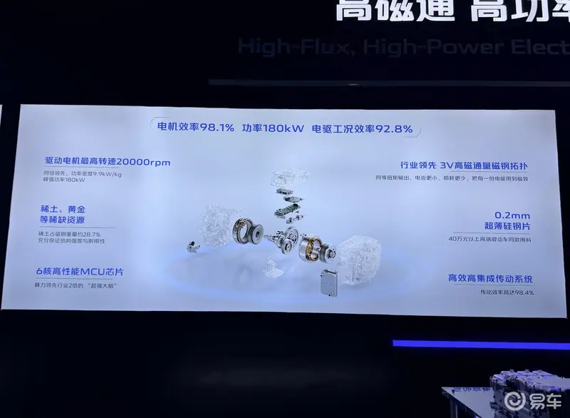 作为高磁通高功率混动电驱的“心脏”,行业首发的3V高磁通量磁钢拓扑结构,相比于传统的2V结构,大幅提升电机气隙内的磁通量,同时转子结构采用豪车上才使用的0.2mm超薄硅钢片,让电机最高效率达到98.1%,电驱系统综合工况达到92.8%。同时,这套混动电驱还有一个特点:体积小、效率高。体积仅107L,重量仅97千克,比同级轻10%-20%。最高转速达到20000rpm,峰值功率180kW。功率密度高达9.9kW/kg;同时,其搭载比行业高出53.3%算力的6核高性能MCU芯片,实现毫秒级精准控制。