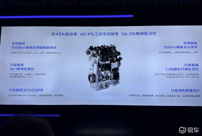 蓝鲸超擎混动搭载的超高压直喷技术混动发动机,热效率近45%,喷油压力高出行业水平(350Bar)42%。同时配备了行业领先的高磁通高功率混动电驱,电机最高效率达到98.1%。蓝鲸超擎混动搭载全球首发且最高的500Bar超高压燃油喷射系统,喷射压力达到丰田 250Bar的两倍;同时配备全球首发150mJ高能点火系统以及1.45行业最高行程缸径比,在高达16:1超高压缩比条件下高效清洁燃烧,实现1500-4200转速下达成40.9%的平均工况效率,56.3%高效区占比,平均热效率与丰田最高热效率41%比肩。
