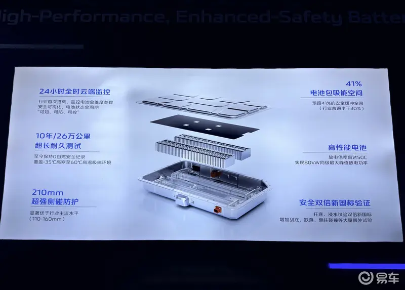 在电池方面,实现高达50C的放电倍率和80kW的峰值放电功率,让动力输出更为强劲;并通过预留41%吸能空间及远超国标的严苛测试,在确保安全的前提下实现最优能效平衡。同时还有24小时全时电池云端监控预警,支持用户端安全可视化,实现电池状态全周期可知、可防、可控,时刻护航出行安全。