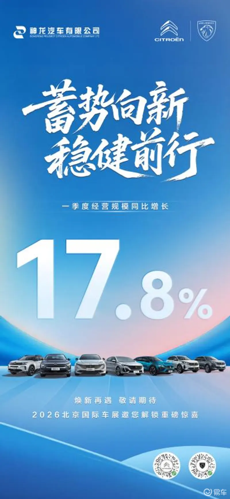 易车讯 4月1日,神龙汽车有限公司宣布一季度经营规模同比增长17.8%。在即将到来的2026北京国际车展,神龙汽车旗下东风标致、东风雪铁龙品牌焕新再遇,以全新面貌解锁品牌发展的又一重要篇章。