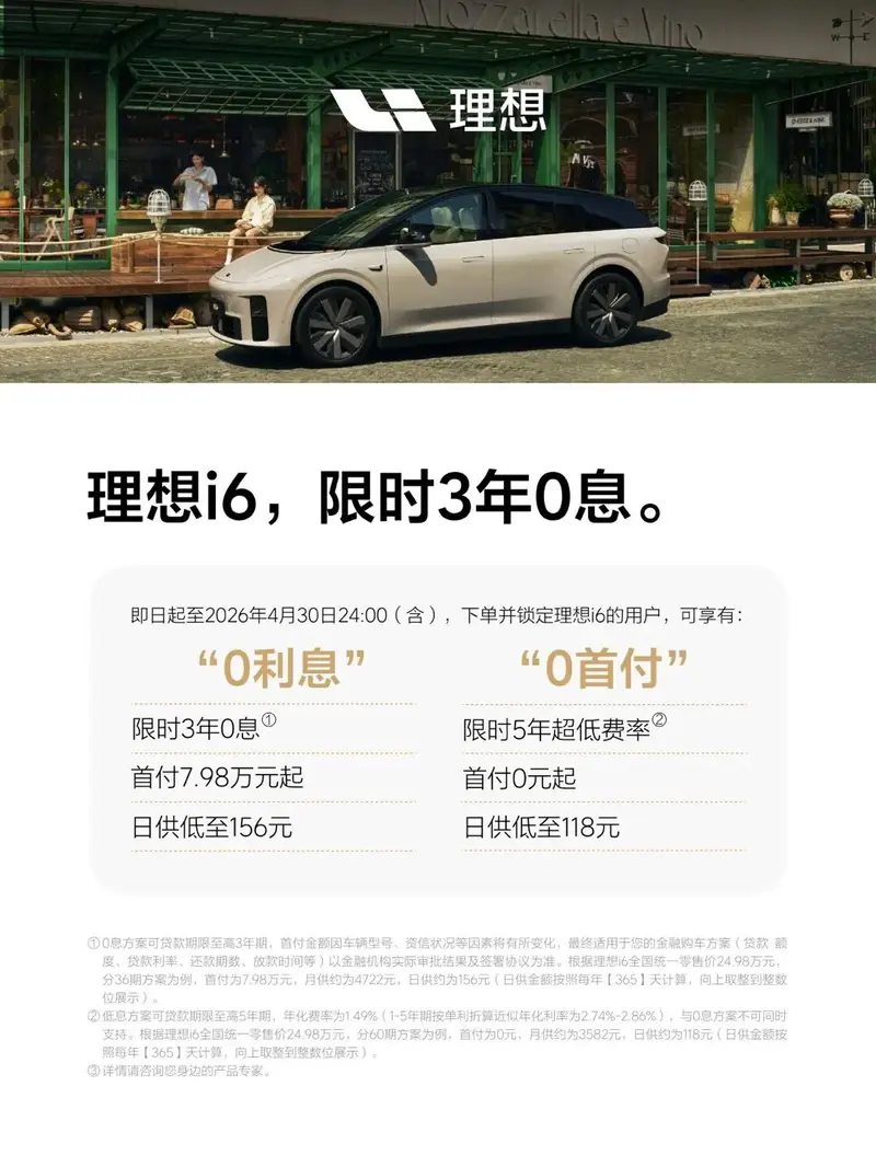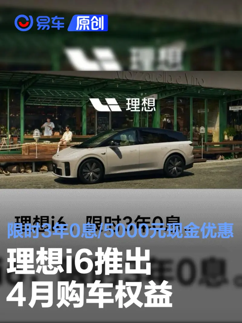 易车讯 4月3日,理想i6宣布推出4月购车权益,日起至4月30日(含)下单理想i6,可享受限时3年0息方案,首付7.98万起,日供低至156元,至高节省1.2万元利息;或选择5年超低月供方案,首付低至0元。