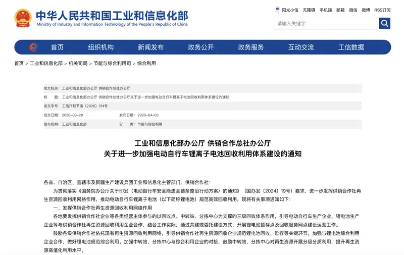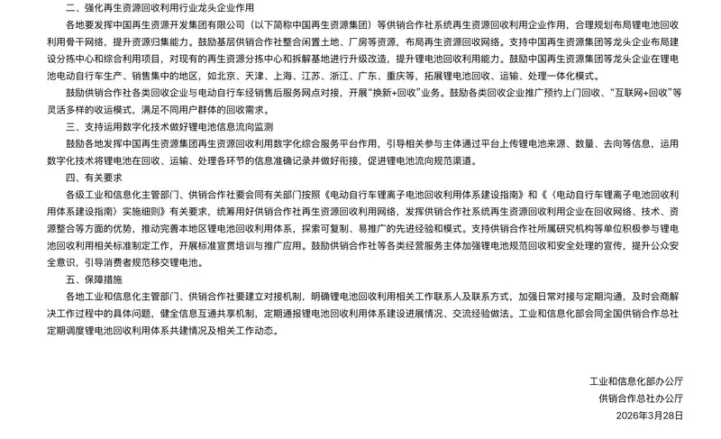 我们从公告获悉,《通知》立足发挥供销合作社再生资源回收利用网络优势,聚焦完善电动自行车锂电池回收利用体系,促进电动自行车锂电池规范回收综合利用的重要举措。《通知》从发挥现有资源作用、强化龙头引领、支持数字监测、做好协同保障等方面作出工作部署。