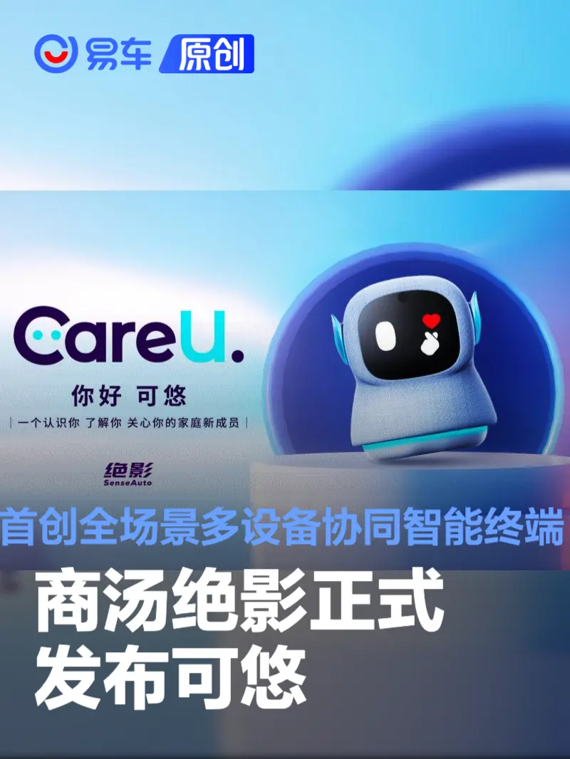 易车讯 4月8日,商汤绝影正式发布可悠(Care U),一个真正走进生活的家庭 AI 新成员。可悠以“认识你、了解你、关心你”为核心使命,依托首创生长型家庭认知记忆框架、全场景多设备智能体协同体系,以及持续自进化能力。可悠的命名,锚定“关心你”这一核心初心,其英文名 “Care U” 直译即为“关心你”,即是产品“认识你、了解你、关心你”的浓缩表达。中文名“可悠”即是“Care U”的精准谐音,“可”代表可靠可信赖、能陪伴能成事,“悠”寓意悠然安心的生活状态。其设计初衷源源自“守护精灵”,以柔软亲肤的材质,打造一个友善、可拥抱的专属存在。
