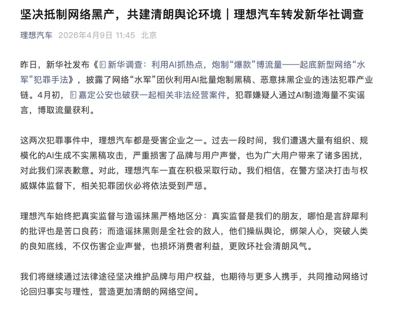 这两次犯罪事件中,理想汽车都是受害企业之一。过去一段时间,我们遭遇大量有组织、规模化的AI生成不实黑稿攻击,严重损害了品牌与用户声誉,也为广大用户带来了诸多困扰,对此我们深表歉意。对此,理想汽车一直在积极采取行动。我们相信,在警方坚决打击与权威媒体监督下,相关犯罪团伙必将依法受到严惩。