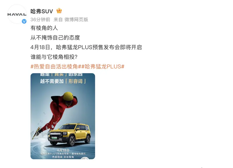 易车讯 4月14日,哈弗官方发布哈弗猛龙PLUS将于4月18日开启预售,提供5座/7座版本可选,采用插混式动力系统,据悉不仅在尺寸上实现了全面升级,还将搭载激光雷达,提供磷酸铁锂电池组或三元锂蓄电池,配备三种不同容量的动力电池可选。
