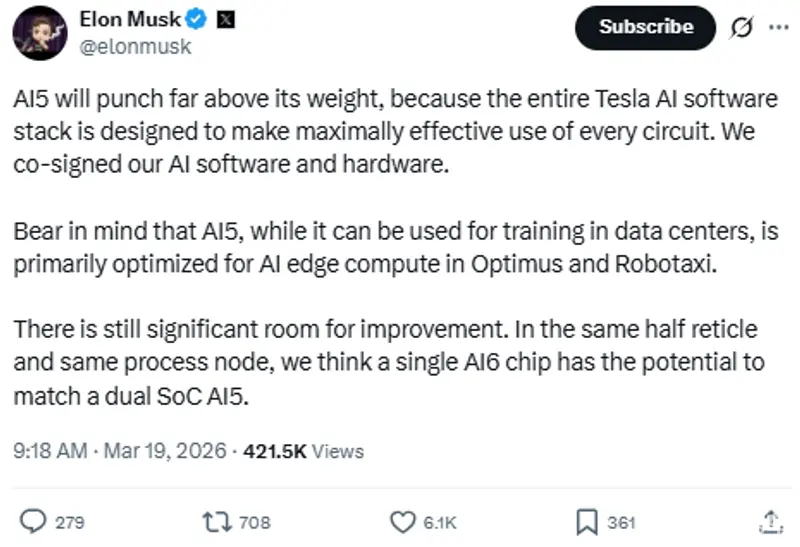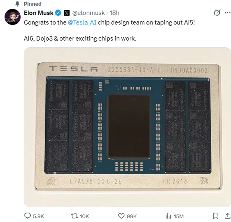 易车讯 近日,特斯拉CEO埃隆・马斯克在社交平台宣布,公司自研的第五代自动驾驶AI芯片(AI5)已成功完成流片,标志着这款备受瞩目的核心硬件从设计阶段迈入量产准备周期。
