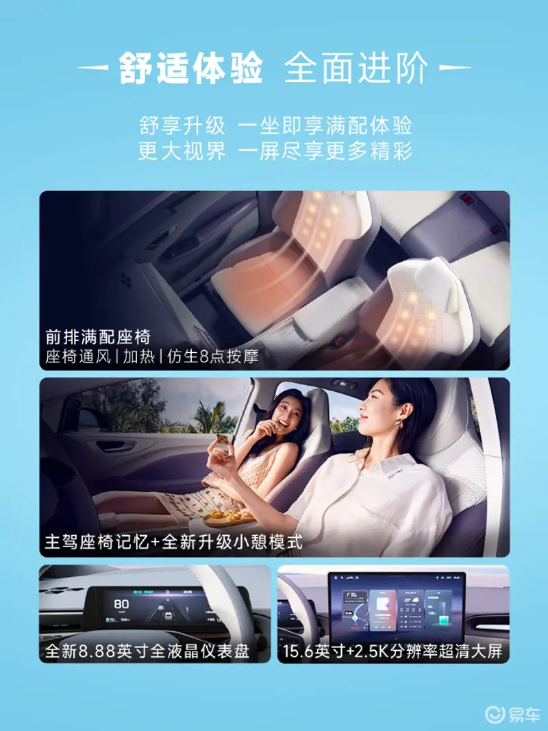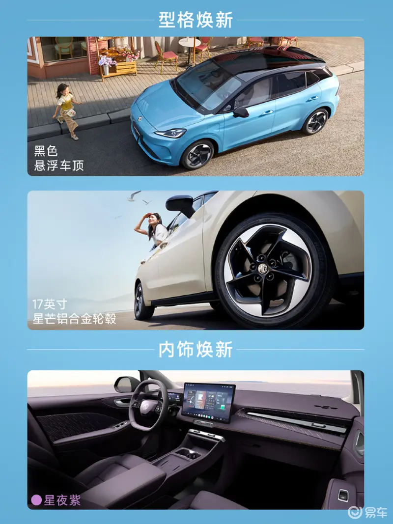 新车在外观、内饰、智能、安全、续航五大维度全面升级,采用家族化设计语言,内饰采用15.6英寸2.5K中控大屏。动力方面,提供纯电版及半固态电池版供选择。