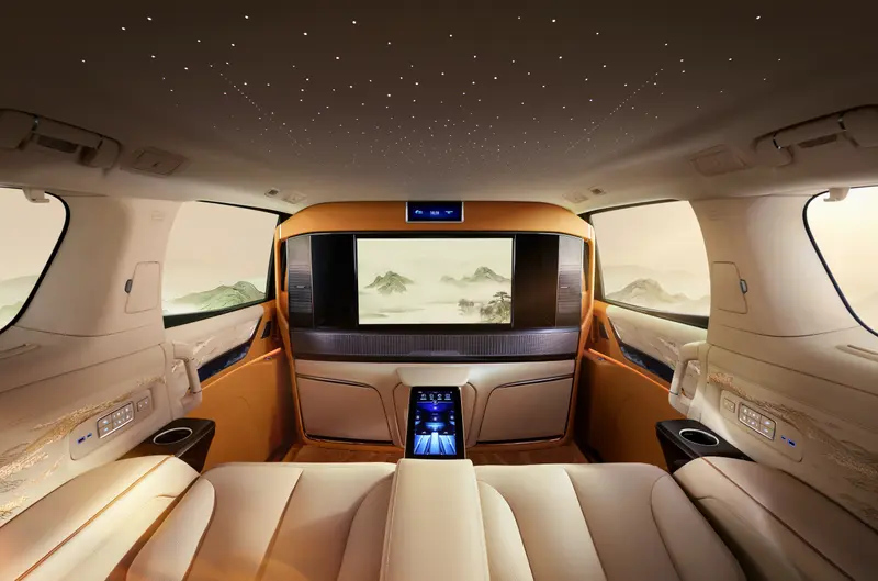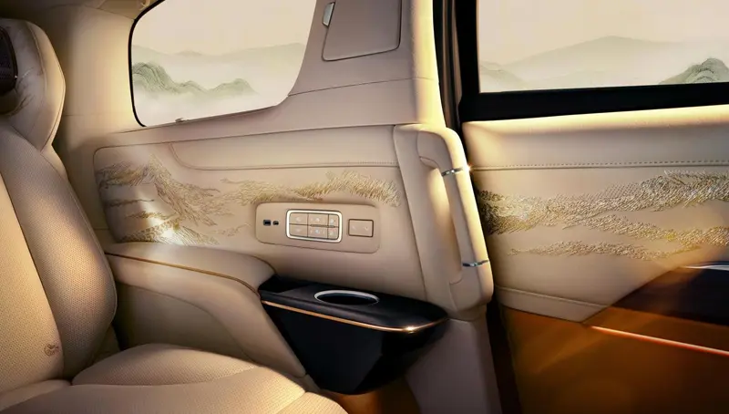 世纪CENTURY以136,092针纯手工“江山如画”主题刺绣打造环抱式山水座舱,15mm手工割绒进口羊毛脚垫,星河绣帷星空顶棚配备8大星空模式与语音触发流星功能。