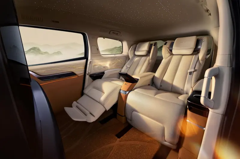 内饰方面,世纪CENTURY以顶级私享四座座舱为核心,四座版车型首创一键礼宾模式,二排座椅于滑移门开合间,同步前移至最佳上车位。座椅采用同级领先12层复合结构,表层甄选北美小公牛皮源Fine Nappa半苯胺顶级真皮,搭配22点分区指压按摩、石墨烯远红外理疗等功能。